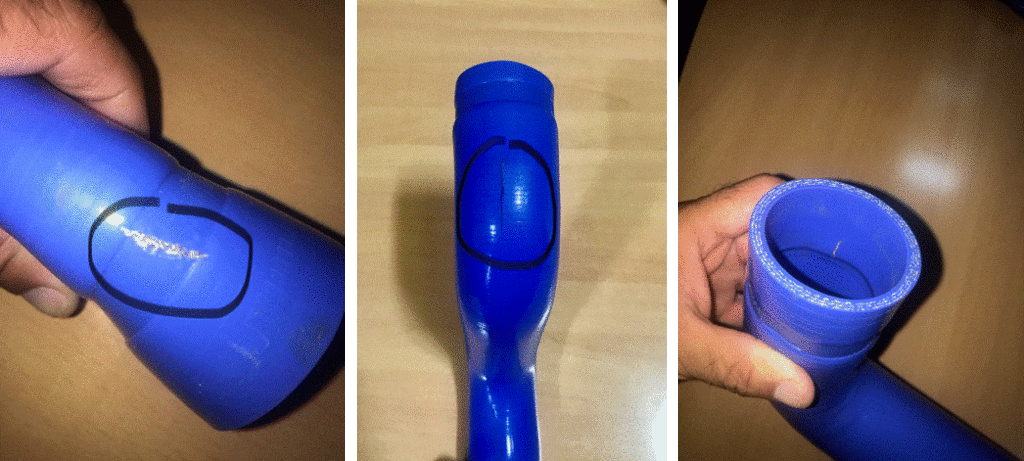 However, the Hose made with the cheaper Silicone Rubber came out with tears on the inside, as well as on the outside. Surprisingly, all 3 fabric layers was intact; and the tears were limited to the inner tube, and the outer cover, both consisting of plain Silicone Rubber