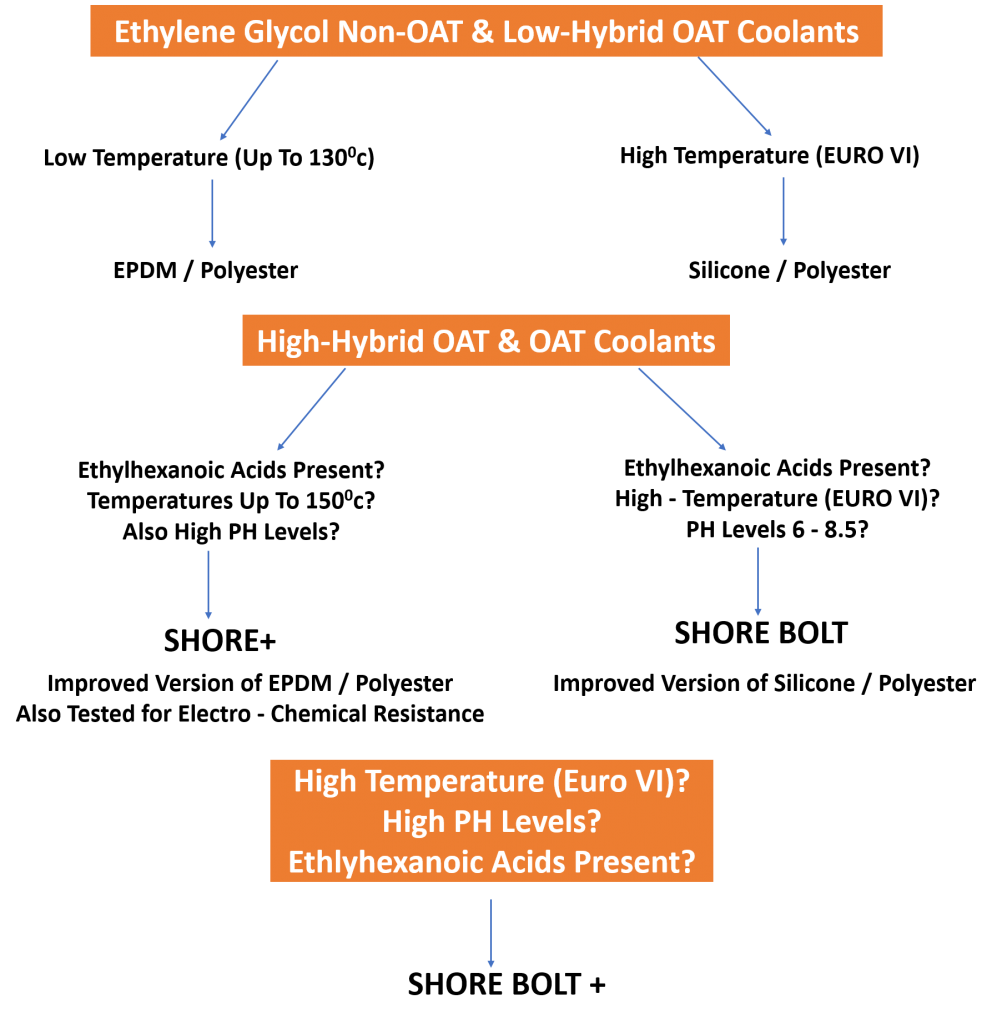 Please see the below flowchart/ready-reckoner, to choose the correct hose depending on the coolant and other working conditions. Silicone Hoses might not work for some OAT or hybrid-OAT coolants, even if EHAs are absent. Using the wrong hoses can lead to coolant losses (sweating), and damage to the fabric reinforcement layer, causing pre-mature hose failures.